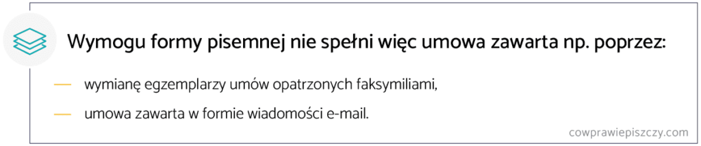 Równie istotna, jak treść umowy prawnoautorskiej, może okazać się jej forma. Umowa o przeniesienie praw autorskich oraz umowa licencji wyłącznej powinny zostać zawarte w formie pisemnej – i to pod rygorem nieważności. Oznacza to, że do zawarcia ważnej umowy wymagane jest złożenie przez obie strony odręcznych podpisów na egzemplarzu umowy.