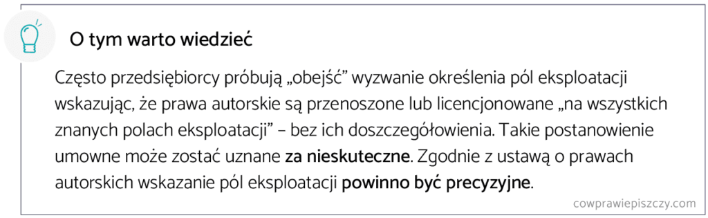 Niezbędnym elementem każdej umowy prawnoautorskiej jest określenie pól eksploatacji utworów, czyli ekonomicznych sposobów korzystania z nich. Pola eksploatacji określają, w jaki sposób utwór będzie mógł być wykorzystywany przez nabywcę lub licencjobiorcę (np. drukowanie, sprzedaż kopii, udostępnianie w internecie). Brak uwzględnienia tego elementu w umowie może prowadzić do uznania jej za nieważną (umowa nie przeniesie praw autorskich).