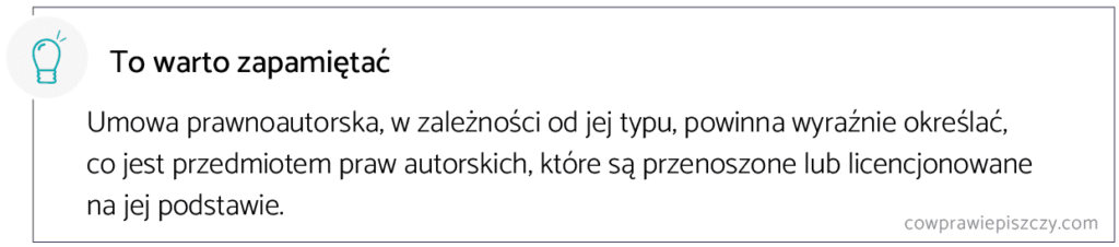 Precyzyjne określenie przedmiotu praw autorskich nie zawsze będzie proste. Łatwiej go wskazać, gdy umowa prawnoautorska dotyczy np. praw do dzieła, które już powstało albo które ma powstać w wyniku wykonania umowy – np. logotypu lub obrazu/grafiki. Sytuacja może się skomplikować, w przypadku gdy:
