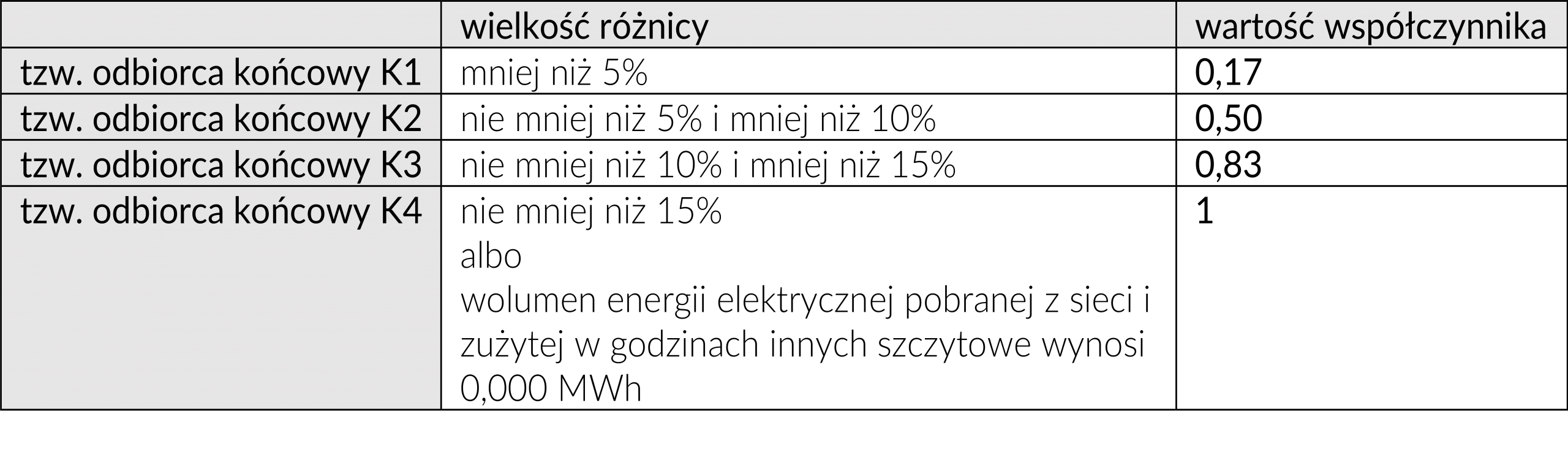 W konsekwencji im większa jest różnica, tym wyższy jest współczynnik (a co za tym idzie – wyższa jest wysokość opłaty mocowej). Wartość współczynnika została przyporządkowana jn.:
