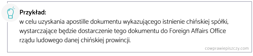 Dla uzyskania legalizacji dokumentu wystarczające jest obecnie zwrócenie się do właściwych krajowych organów lub instytucji – pominięta została zatem konieczność angażowania polskiego konsula lub Chińskiej Ambasady w Polsce.
