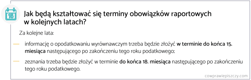 W stosunku do roku przejściowego, zeznanie dotyczące Pillar 2 składa się w administracji podatkowej państw członkowskich, nie później niż w ciągu 21 miesięcy od ostatniego dnia sprawozdawczego roku podatkowego, będącego rokiem przejściowym. Przyjmując więc, że rokiem przejściowym był 2024 r., termin ten upływa 30 września 2026 r.