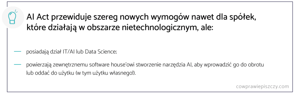 Wbrew powszechnej opinii AI Act nie jest skierowany jedynie do branży IT/AI. Głównym adresatem nowych obowiązków pozostają dostawcy sztucznej inteligencji, czyli zarówno developerzy oprogramowania AI, jak i wszyscy inni przedsiębiorcy, którzy samodzielnie opracowują systemy AI lub zlecają ich budowę