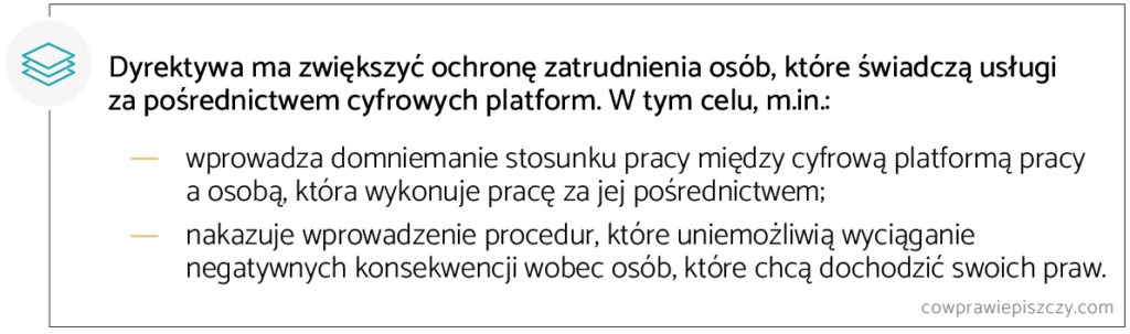 Dyrektywa ma na celu zwiększenie ochrony zatrudnienia osób, które świadczą usługi za pośrednictwem cyfrowych platform. Z uwagi na to, że ten model zatrudniania nie znajduje odzwierciedlenia w przepisach prawnych, to „pracownicy platformowi” z reguły nawiązują współpracę na różnych podstawach cywilnoprawnych (umowa zlecenia, dzieło itp.). To przekłada się na brak albo bardzo ograniczone uprawnienia socjalne czy też pracownicze.