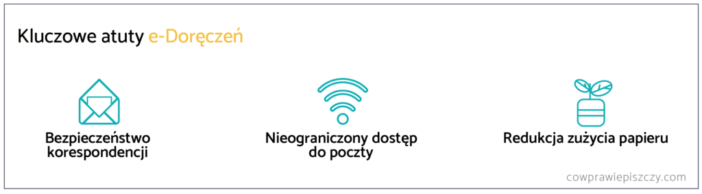 Kolejna zaleta e-Doręczeń dotyczy dostępności do skrzynki – można z niej korzystać w każdej chwili oraz na dowolnym urządzeniu. Dzięki temu da się ominąć długie kolejki na poczcie. Dodatkowo e-Doręczenia są częścią szerszej idei paperless. Korzystanie z tego rozwiązania umożliwia ograniczenie zużycia papieru, co ma pozytywny wpływ na środowisko naturalne.