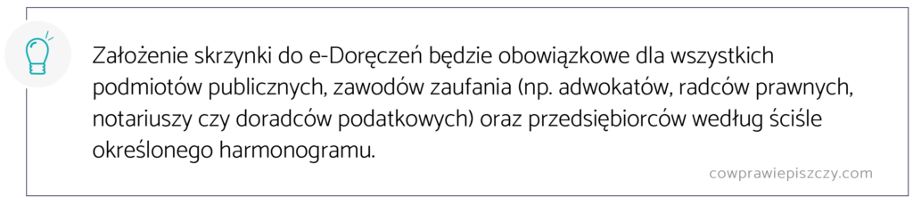Dodatkowo posiadanie adresu do e-Doręczeń będzie obligatoryjne dla wszystkich podmiotów, co ułatwi komunikację pomiędzy przedsiębiorcami a organami administracji publicznej. Jedynie osoby fizyczne będą mogły wybrać, czy chcą korzystać z elektronicznej skrzynki.