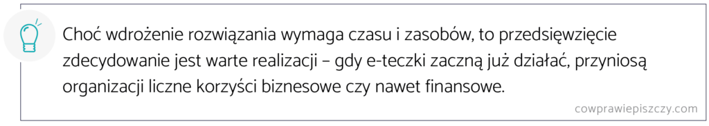 Kluczem do sukcesu we wdrażaniu e-teczek jest zaangażowanie działów HR oraz IT, a także wybór odpowiedniego narzędzia. To ostatnie musi spełniać wymogi rozporządzenia Ministra Rodziny, Pracy i Polityki Społecznej w sprawie dokumentacji pracowniczej. Dobra umowa z dostawcą elektronicznego rozwiązania to podstawa sprawnego funkcjonowania e-teczek pracowniczych.