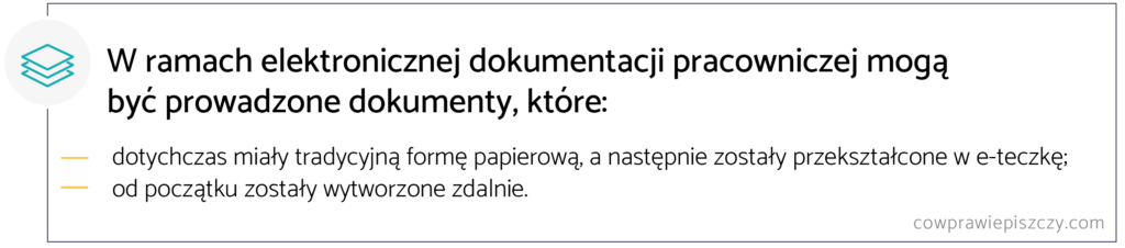 Od 2019 r. przepisy przewidują możliwość prowadzenia dokumentacji pracowniczej i akt osobowych pracowników w formie elektronicznej lub papierowej. Zgodnie z Kodeksem pracy, dokumentacja prowadzona w tradycyjnej formie papierowej może zostać przekształcona na formę elektroniczną.
