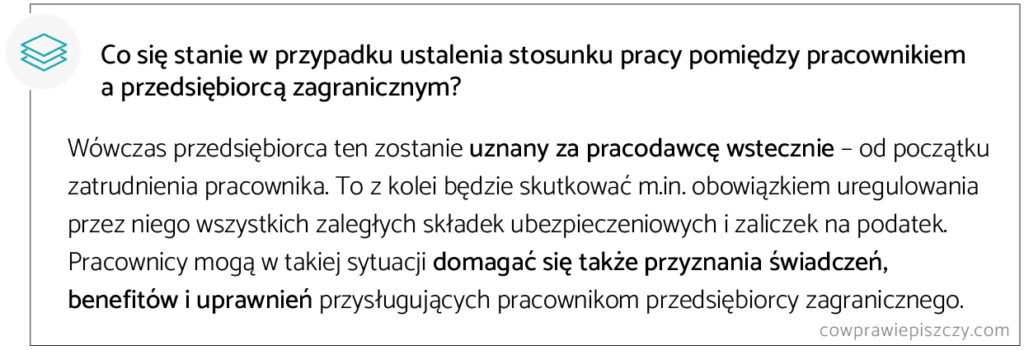 - istnieje wysokie ryzyko ustalenia, że stosunek pracy został w rzeczywistości nawiązany pomiędzy pracownikiem a sprawującym nad nim realny nadzór przedsiębiorcą zagranicznym (a nie EoR).