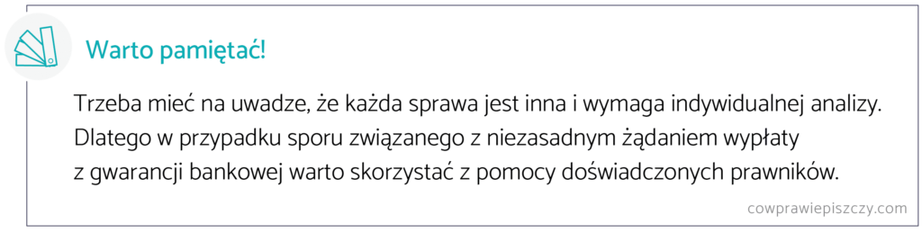 Opisany wyżej przypadek pokazuje, że zleceniodawcy powinni interweniować, gdy beneficjent podejmuje działania mające na celu wypłatę z gwarancji bankowej. Warto pamiętać, że istnieją narzędzia prawne, które mają zastosowanie wobec pozornie niekorzystnych warunków umów i mogą skutecznie ochronić interesy zleceniodawcy poprzez zapobieganie niezasadnej wypłacie środków.