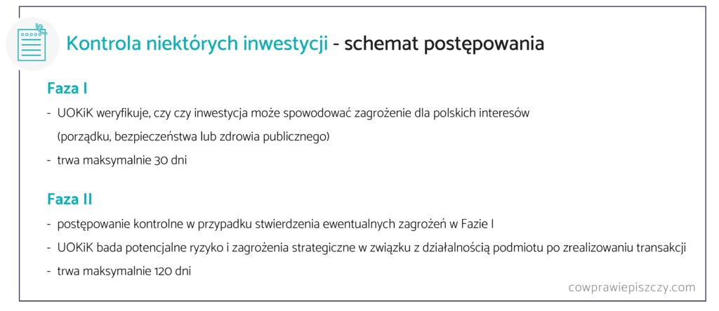 W pierwszym przypadku, po zgłoszeniu inwestycji do UOKiK rozpoczyna się tzw. faza I, która trwa maksymalnie 30 dni. Organ weryfikuje wtedy, czy inwestycja spowoduje zagrożenie dla polskich interesów (porządku, bezpieczeństwa lub zdrowia publicznego).