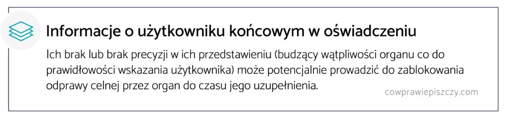 W dotychczasowych wyjaśnieniach KAS wskazuje, że w wielu przypadkach jako użytkownika końcowego będzie się kwalifikować kontrahenta eksportera. Jednak w sytuacji, gdy ten kontrahent będzie spełniał raczej funkcję „pośrednika” (towary będą podlegać sprzedaży do kolejnych podmiotów zajmujących się ich obrotem), to ograniczenie się przez eksportera do wskazania w oświadczeniu jego kontrahenta jako użytkownika końcowego może nie wystarczyć.