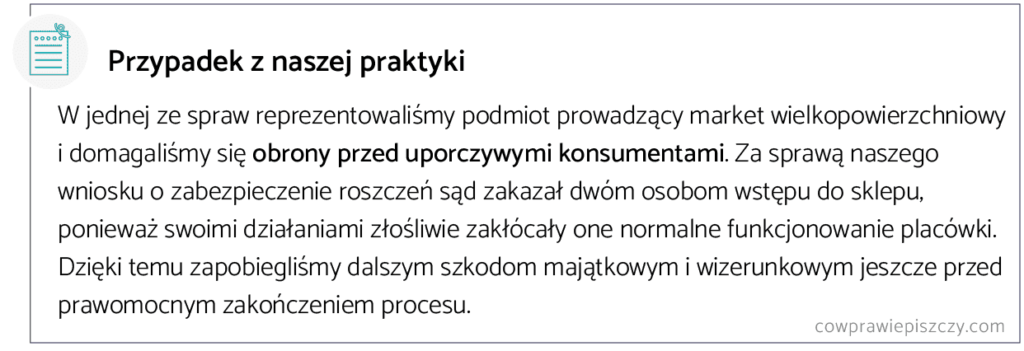 • ochronę dóbr osobistych, np. gdy istnieje ryzyko wystąpienia dalszych działań szkodzących reputacji i dobremu imieniu;