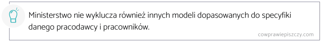 MRPiPS  podkreśla, że skrócenie czasu pracy przynosi korzyści, ale jednocześnie wymaga od pracodawców elastycznego podejścia, dostosowanego do specyfiki danej branży i organizacji. Dlatego pilotaż przewiduje testowanie różnych modeli skróconego czasu pracy, w tym np.: