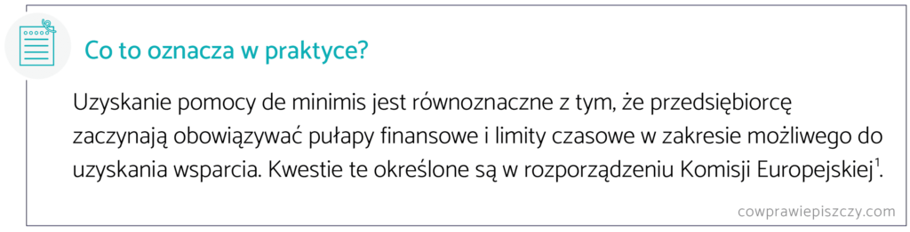 [1] Rozporządzenie Komisji (UE) 2023/2831 z dnia 13 grudnia 2023 r.  w sprawie stosowania art. 107 i 108 Traktatu o funkcjonowaniu Unii Europejskiej do pomocy de minimis.