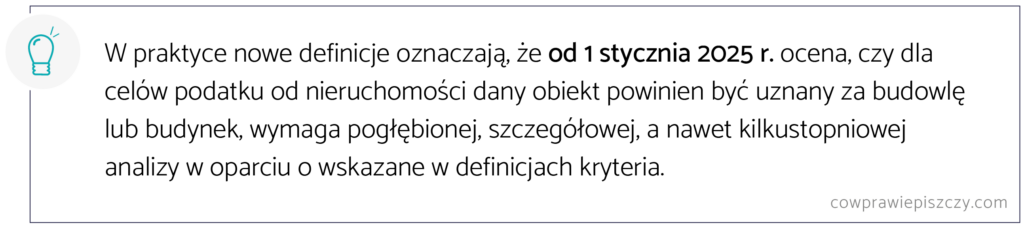 Treść nowych definicji wskazuje wyraźnie, że od 1 stycznia 2025 roku ocena, czy dany obiekt dla celów podatku od nieruchomości powinien być uznany za budowlę lub budynek wymaga bardzo szczegółowej analizy w oparciu o wskazane w definicjach kryteria.