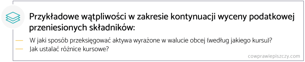W przypadku podatkowej wyceny przeniesionych składników majątkowych kluczowa jest kwestia exit tax-u. Jeśli przy przeniesieniu spółka zapłaciła ten podatek, to w Polsce wartość podatkową wspomnianych składników majątku ustala się w wysokości ich wartości, określonej dla celów opodatkowania ich zagranicznym podatkiem od dochodów z niezrealizowanych zysków.