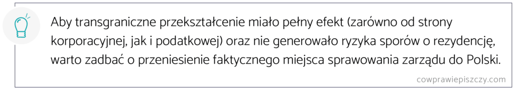 Warto wiedzieć, że transgraniczne przekształcenie i związane z nim czynności (takie jak rejestracja w polskim KRS, przyjęcie polskiej formy prawnej (np. spółki z o.o.) czy określenie siedziby na terytorium Polski) nie muszą być równoznaczne ze zmianą rezydencji podatkowej. W tym przypadku kluczowe jest miejsce faktycznego zarządu spółki.