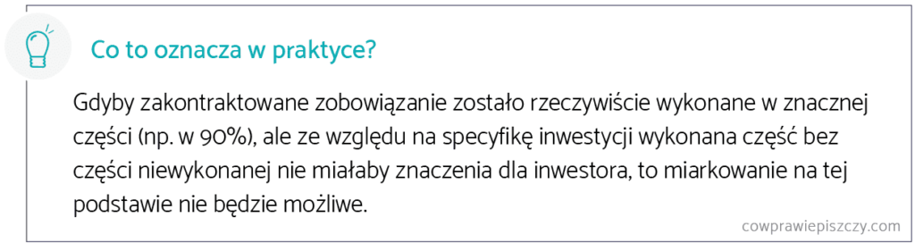 W praktyce przy umowach o roboty budowlane o wykonaniu zobowiązania w znacznej części można mówić jedynie, gdy roboty w całości lub części zostały przekazane inwestorowi[1]. Jednak w teorii – przy ocenie stopnia wykonania zobowiązania sąd bierze pod uwagę perspektywę obu stron umowy.