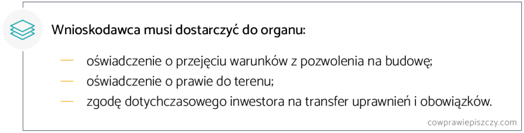 Ostatni z wymienionych nie jest wymagany w przypadku nabycia nieruchomości przez nowego inwestora. Jeśli wskazane warunki są spełnione, to organ ma obowiązek przeniesienia pozwolenia.