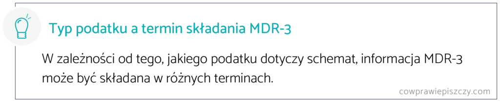 Jeśli więc schemat dotyczy podatku CIT, to informacja MDR-3 powinna zostać złożona w terminie złożenia deklaracji CIT. Analogicznie – o schemacie związanym z VAT trzeba zaraportować do KAS w terminie złożenia deklaracji dotyczącej tego podatku.