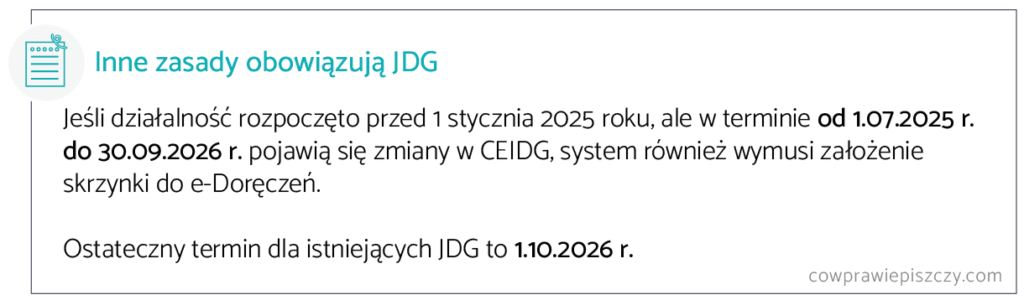 Założona w 2025 roku jednoosobowa działalność gospodarcza lub spółka musi uzyskać taki adres od razu. Z kolei spółki, które rozpoczęły działalność przed 2025 r. muszą posiadać adres i ADE do 1 kwietnia 2025 r.