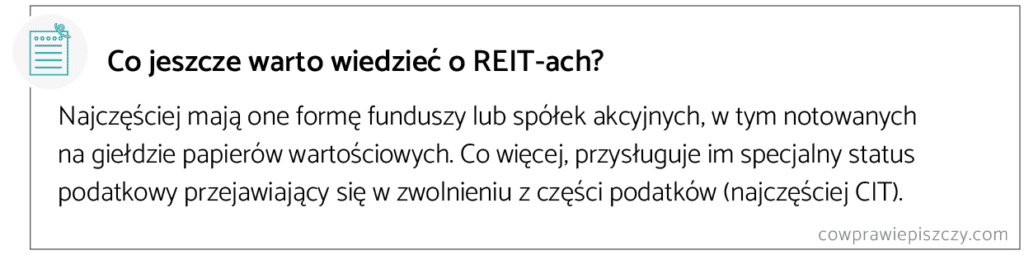 Konstrukcja spółki typu REIT, w szczególności notowanie takiego podmiotu na giełdzie papierów wartościowych, pozwala na dostęp do wspomnianego sposobu inwestowania także drobnym inwestorom.