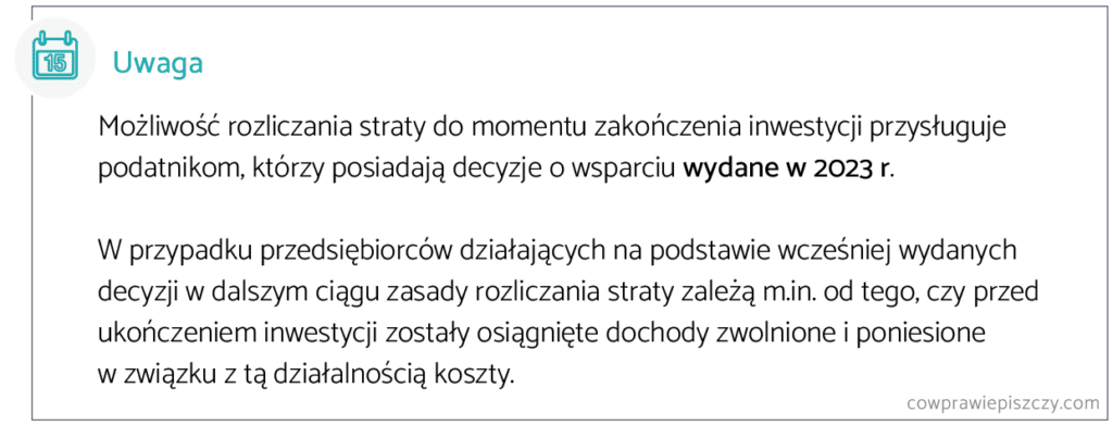 Jeśli zaś chodzi o rozliczanie straty do momentu zakończenia inwestycji, to jest to możliwe w przypadku podatników posiadających decyzję o wsparciu wydane w 2023 r. Sytuacja pozostałych przedsiębiorców zależy m.in. od tego, czy przed ukończeniem inwestycji zostały osiągnięte dochody zwolnione i poniesione w związku z tą działalnością koszty.