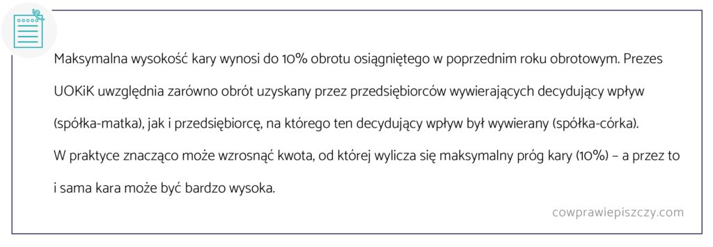 Maksymalna wysokość kary wynosi do 10% obrotu osiągniętego w poprzednim roku obrotowym. Prezes UOKiK uwzględnia zarówno obrót uzyskany przez przedsiębiorców wywierających decydujący wpływ (spółka-matka), jak i przedsiębiorcę, na którego ten decydujący wpływ był wywierany (spółka-córka). W praktyce znacząco może wzrosnąć kwota, od której wylicza się maksymalny próg kary (10%) – a przez to i sama kara może być bardzo wysoka.
