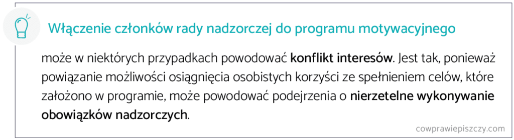 Włączenie członków rady nadzorczej do programu motywacyjnego, którego realizacja uzależniona jest od osiągnięcia konkretnych celów lub wyników, może w niektórych przypadkach powodować konflikt interesów.