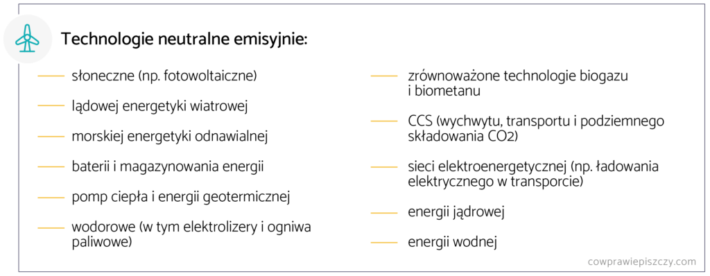Technologie neutralne emisyjnie to wymienione w rozporządzeniu technologie będące produktami końcowymi, konkretnymi komponentami lub konkretnymi maszynami używanymi głównie do wytwarzania tych produktów. Chodzi m.in. o technologie: