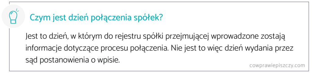 Dzień połączenia spółek to dzień, w którym do rejestru spółki przejmującej wprowadzone zostają informacje dotyczące połączenia. Nie jest to więc dzień wydania przez sąd postanowienia o wpisie. W praktyce zdarzenia te nie muszą wystąpić tego samego dnia. Przykładowo – z uwagi na awarię systemu KRS, dane zawarte w postanowieniu sądu mogą zostać wprowadzone do rejestru w innym dniu.