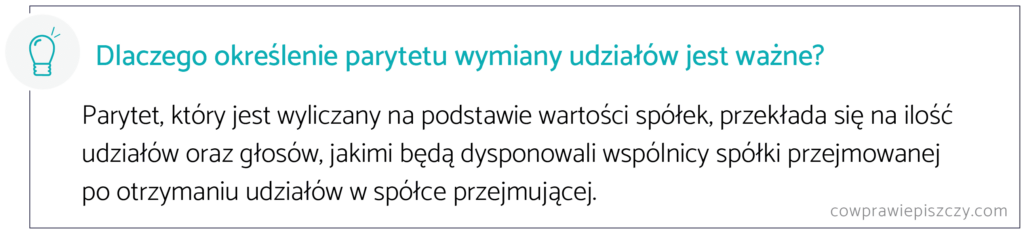 Mimo że KSH[1] zwraca uwagę jedynie na konieczność wyceny spółki przejmowanej, to w praktyce należy wycenić również wartość spółki przejmującej. Jest to związane z ustaleniem parytetu wymiany udziałów spółki przejmowanej na udziały spółki przejmującej.